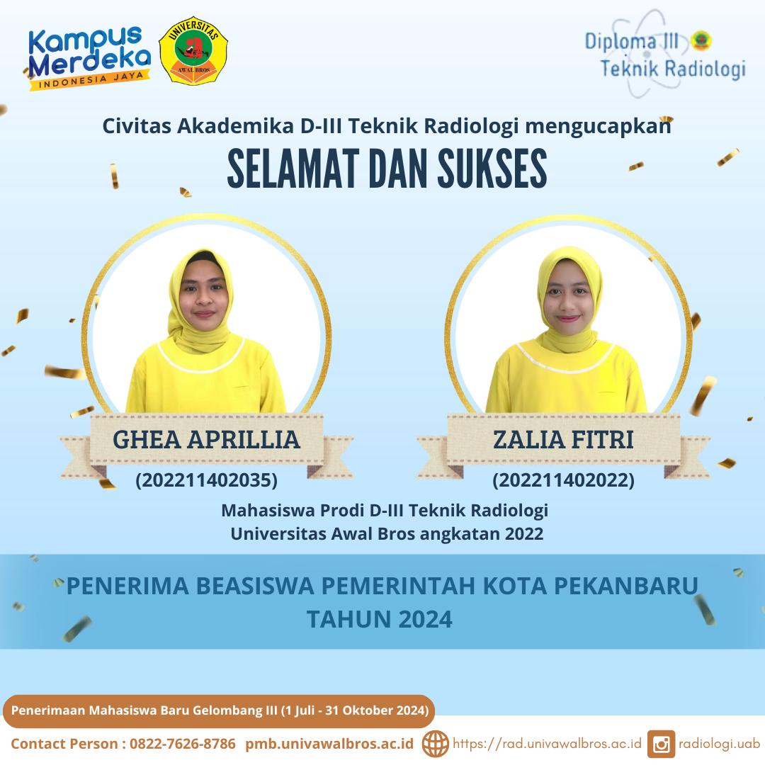Mahasiswa Universitas Awal Bros Fakultas Ilmu Kesehatan, Program Studi D III Teknik Radiologi, Ghea Aprillia dan Zalia Fitri, angkatan 2022, baru-baru ini menerima beasiswa dari Pemerintah Kota Pekanbaru. Keberhasilan ini bukan hanya menjadi kebanggaan bagi mereka, tetapi juga bagi universitas dan lingkungan sekitar. Pemerintah Kota Pekanbaru berharap dengan pemberian beasiswa ini dapat meningkatkan kualitas sumber daya manusia sebagai pelaku utama pembangunan di Kota Pekanbaru, salah satunya melalui mahasiswa Universitas Awal Bros. Pihak Universitas Awal Bros mengapresiasi langkah Pemerintah Kota Pekanbaru dalam memberikan dukungan kepada mahasiswanya.